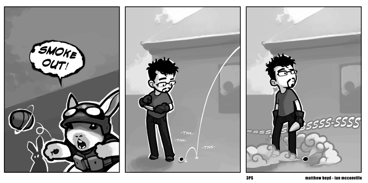 So when they called for someone to help with fundraising, I knew this was something I could help with. I immediately started work on brainstorming some ideas around ‘rabbit rescue’. My husband pointed me towards an online comic, Three Panel Soul, that he remembered from several years ago, which I used as inspiration (you can clearly see a couple of the poses were strongly modelled on this artist’s work, as I came to grips with the medium, having never drawn ‘action rabbits’ before. i’ve posted the three relevant panels from his site below – this is not my work.